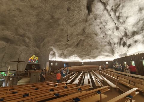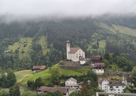 Danach geht’s hinunter in Rhonetal, rechts der Blick auf die Stadt Brig mit dem bekannten Stockalperschloß von 1671, weiter zunächst bis zu kleinen Gemeinde Raron. Wir besichtigen hier eine architektonische Rarität, eine Kirche, die in ihrer gesamten Größe in ein Felsmassiv hineingebaut wurde, direkt unter der mittelalterlichen Burgkirche St. Romanus.
