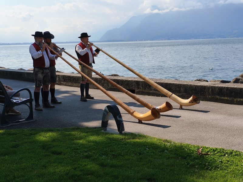Heute ist Markttag in Vevey, unser erster Abstecher führt dorthin. Beim Bummel entlang der Uferpromenade lauschen wir einem Alphornbläser-Trio am See und entdecken schließlich auch die Statue Charlie Chaplins, der seine letzten Lebensjahre in Vevey verbrachte und dem man nach seinem Tod in einer kleinen Kapelle oberhalb von Vevey inmitten der Weinberge eine letzte Ruhestätte einrichtete.