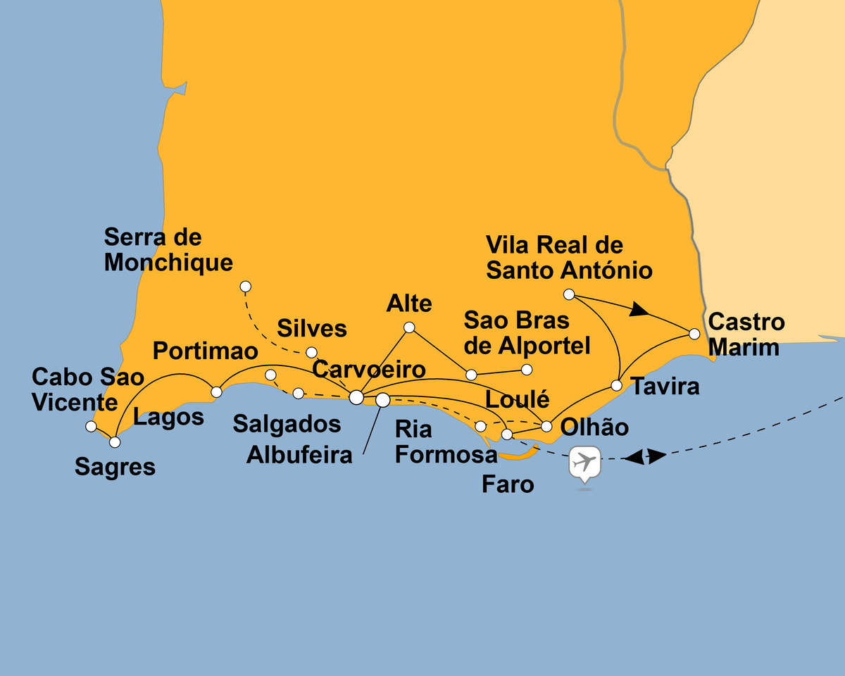 - Ausflüge: Östliche Algarve mit Faro; nach Lagos über Sagres zum Cabo Sao Vicente; nach Alte über Loulé nach Estói