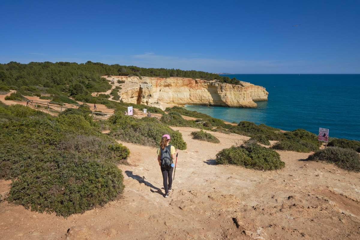 Die heutige Wanderung verläuft auf einem der spektakulärsten Wege an der Algarve, der entlang der Küste verläuft. Der Sete Vales Suspensos wird auch der Pfad der „sieben hängenden Täler“ genannt und verläuft zwischen dem berühmten Strand Praia da Marinha und dem Praia de Vale Centeanes, ein von hohen Klippen eingerahmter Strand. Diese Küstenroute bietet atemberaubende Ausblicke auf den Atlantik, mit imposanten Klippen, versteckten Buchten und einzigartigen Felsformationen. Unterwegs kommt man in die Nähe der Benagil-Höhle, die jedoch nur über das Wasser zugänglich ist. Vom Wanderweg aus hat man ebenso schöne Ausblicke auf das Gebiet. Entlang des Weges können Wanderer eine Reihe von "hängenden Tälern" bewundern, bei denen es sich um durch Erosion entstandene Karstmulden oberhalb der Küste handelt, die über Jahrtausende hinweg durch Erosion in das Kalk- und Sandgestein geformt wurden und diese beeindruckende Landschaft prägen. Die heutige Route umfasst einige steile Auf- und Abstiege und enge Passagen in der Nähe der Klippen.