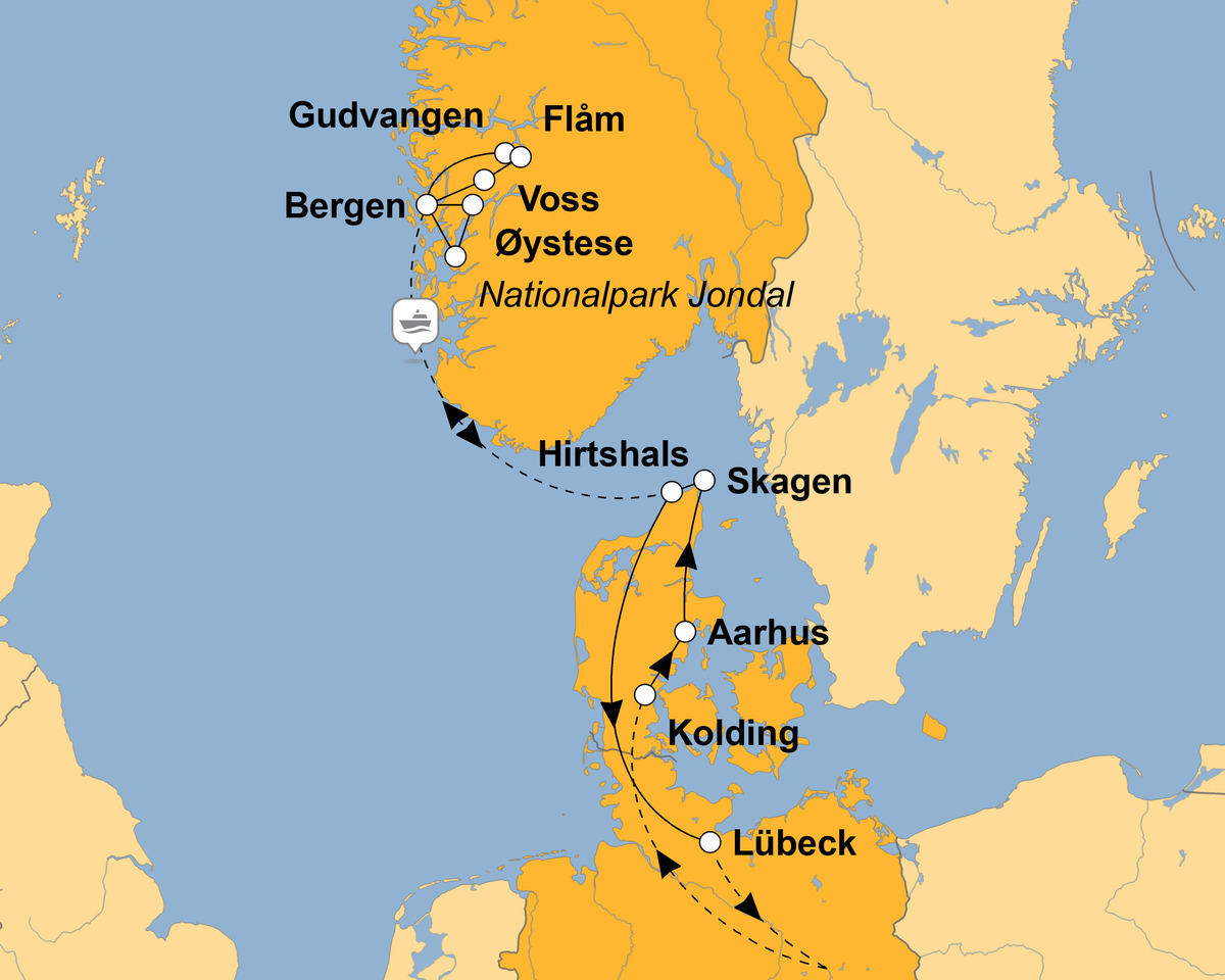 Sie beginnen Ihre Reise im charmanten Kolding. Vielleicht kosten Sie ein Smørrebrød und spazieren entspannt durch die dänische Hafenstadt? Weiter geht es an die Ostküste Jütlands, nach Aarhus, kreatives Zentrum Skandinaviens. In Skagen angekommen, können Sie mit einem Bein in der Nord- und mit dem anderen in der Ostsee stehen. Dabei wartet ein besonderes Highlight auf Sie: eine Traktorfahrt hinaus an die Dänemarkspitze. Abends gleiten Sie dann mit der Fähre hinaus aufs Meer. Es geht durch die Nacht Richtung Norwegen, dem Hauptziel unserer Reise: nach Bergen. Bunte Holzhäuser, enge Gassen, Seeluft: Das Flair dieser alten Hansestadt ist ein Genuss, wenn Sie ein wenig bummeln, werden Sie den Herzschlag der norwegischen Fjorde spüren.