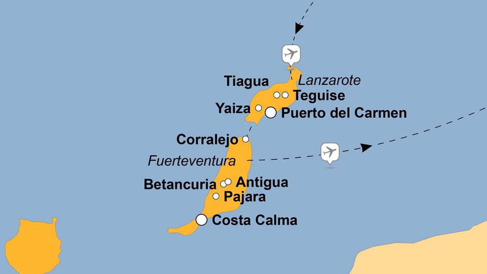 - Flug mit renommierter Fluggesellschaft nach Lanzarote und zurück von Fuerteventura in der Economy Class (Umsteigeverbindung)