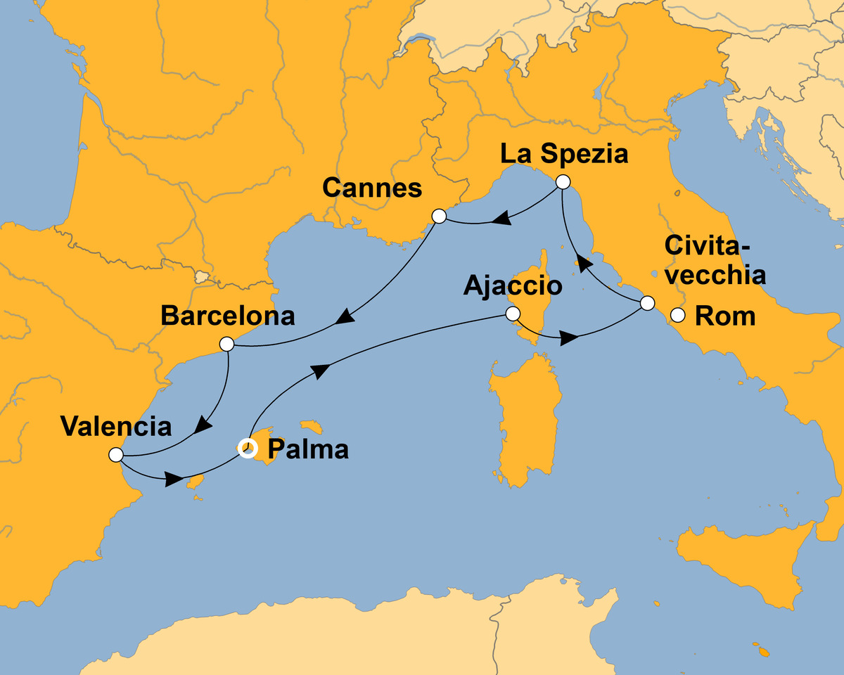 Diese Reise verbindet die schönsten Häfen Spaniens und Italiens auf einer außergewöhnlichen Route. Sie ankern auf Mallorca, in Civitavecchia (Rom), Salerno, Catania auf Sizilien und Cagliari auf Sardinien. Auch Valetta auf Malta werden Sie einen Besuch abstatten. Genießen Sie mediterranes Flair auf dieser Kreuzfahrt und lassen Sie sich verwöhnen!