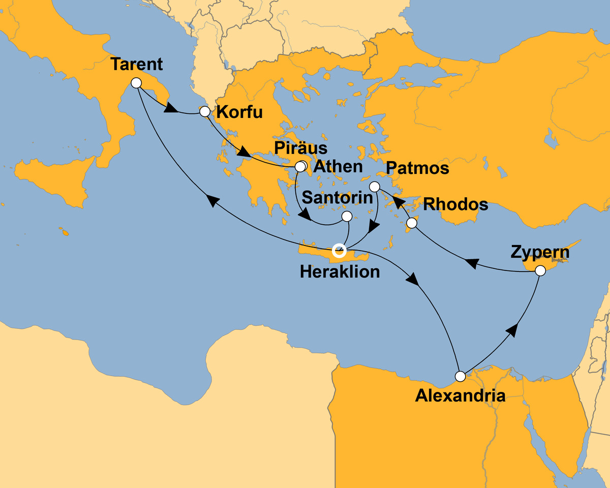 Heraklion – Korfu – Piräus – Alexandria – Limassol – Rhodos – Heraklion