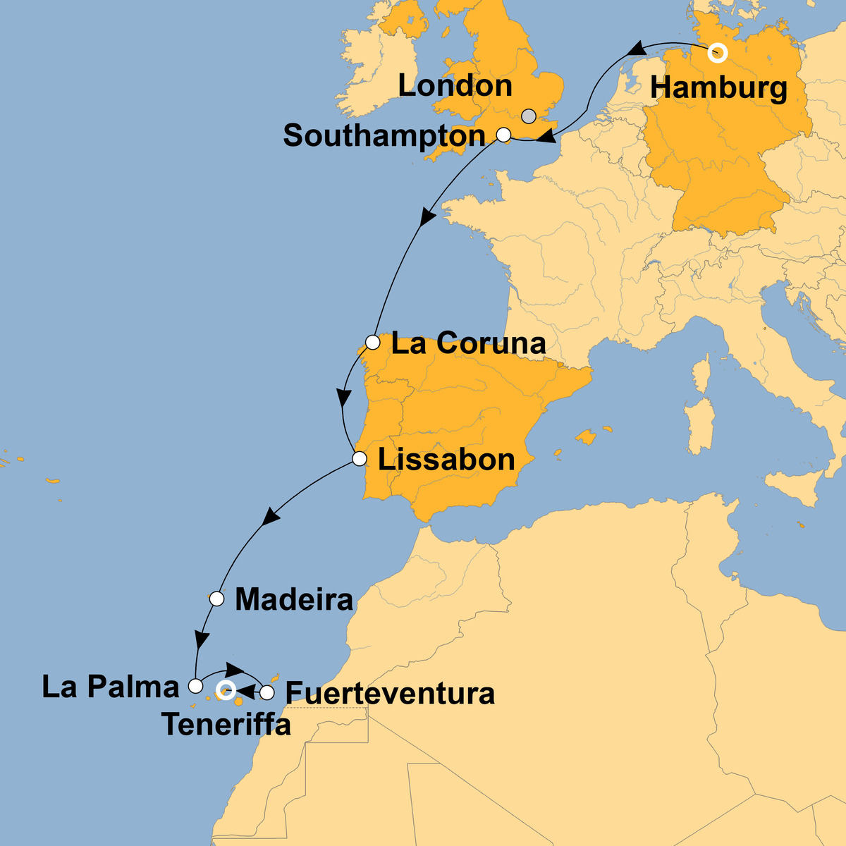 | 13. Tag: | Santa Cruz / Teneriffa / Kanaren | 04:30 | Ausschiffung; Transfer zum Flughafen; Rückflug; Heimreise | |