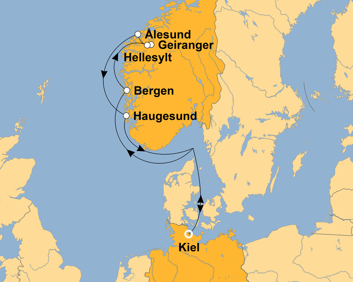 Es geht nordwärts! Kommen Sie an Bord von MEIN SCHIFF® und entdecken Sie atemberaubende Küsten und landestypische Hafenstädte. Freuen Sie sich unter anderem auf spektakuläre Fjorde wie den Geirangerfjord oder den Sunnylvsfjord. In allen Häfen wird Ihnen ein umfangreiches Ausflugsprogramm geboten, das Ihnen die Schönheit Norwegens näherbringt.
