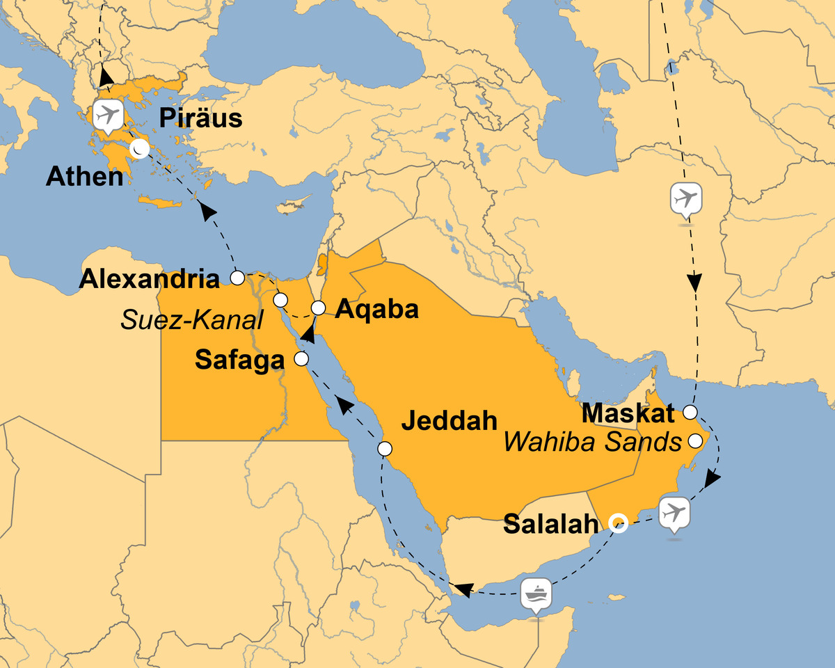 Durch den Suez-Kanal vom Orient in den Okzident führt Sie diese einmalige Kreuzfahrtroute. Neben dem Oman, welchen Sie bereits während eines intensiven Vorprogramms kennen lernen, erleben Sie den bedeutendsten Hafen Saudi Arabiens in Jeddah ebenso, wie Aqaba in Jordanien und Safaga sowie Alexandria in Ägypten. So bekannte Ziele wie die eindrucksvolle Wüstenlandschaft des Wadi Rum, die rosarote Felsenstadt Petra, das Weltwunder Pyramiden von Giseh und die einmaligen Tempelanlagen im Tal der Könige sind nur eine Busfahrt entfernt. Krönender Abschluss dieser ganz besonderen Reiseroute ist die Stadtrundfahrt in Athen, mit der Ihre Kreuzfahrt endet.